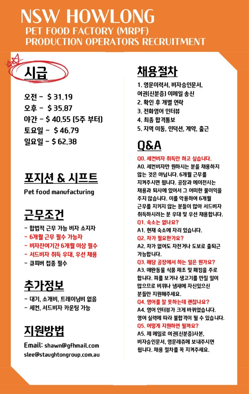 [남자 2명] NSW Howlong 애완동물 식품 제조 공장 구인